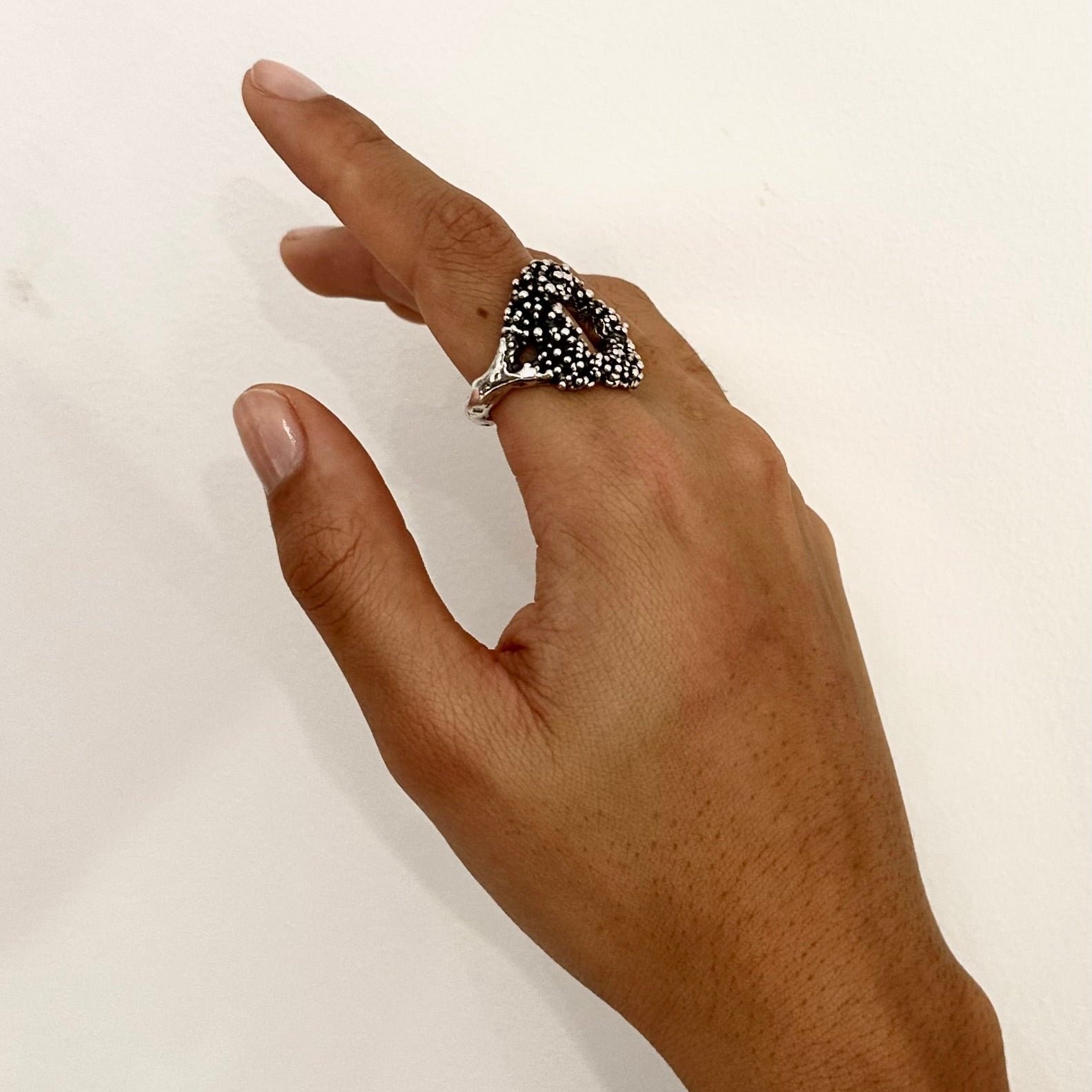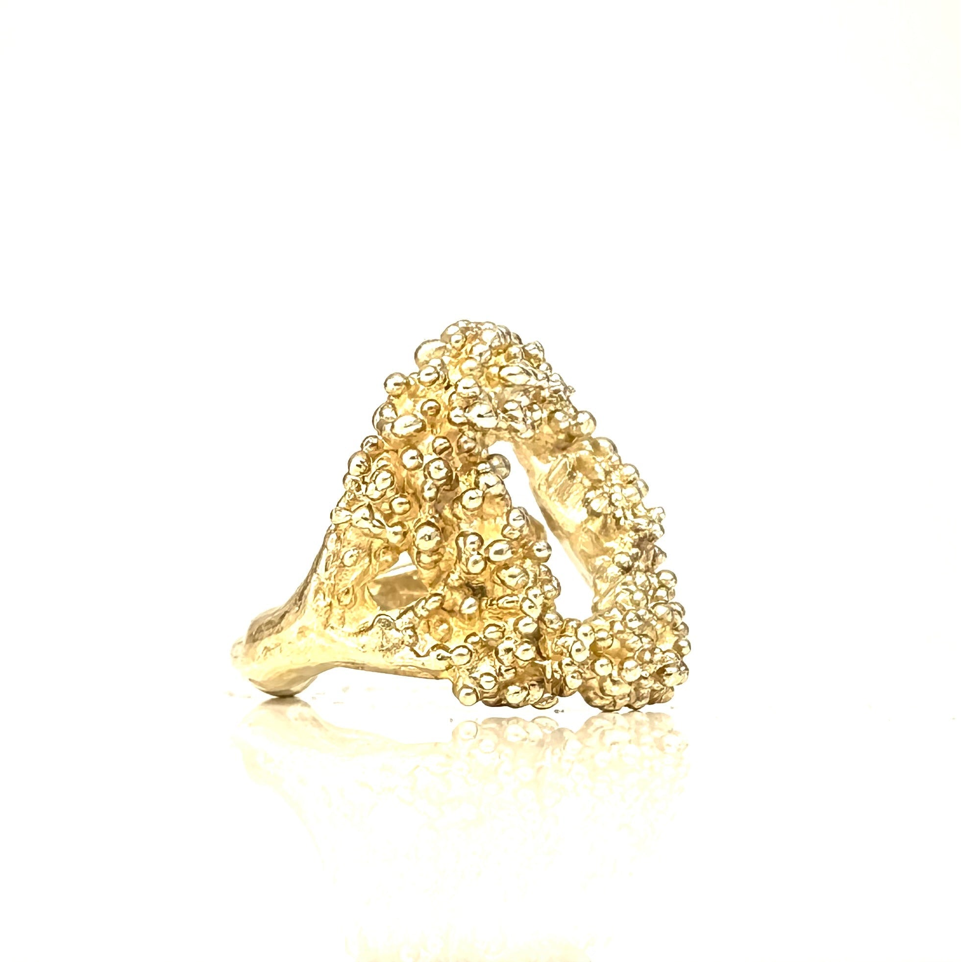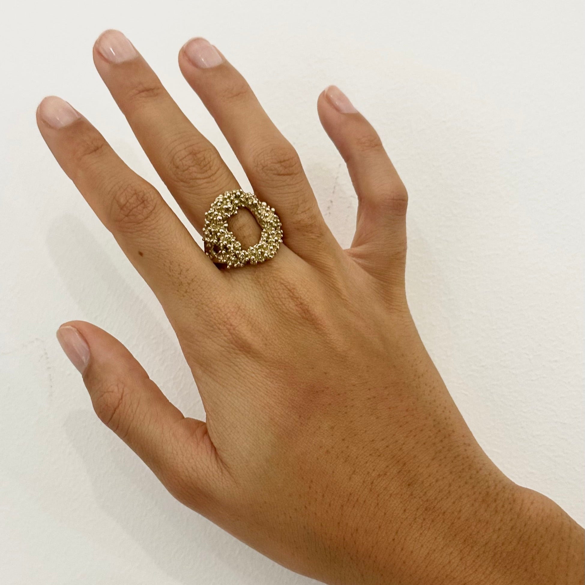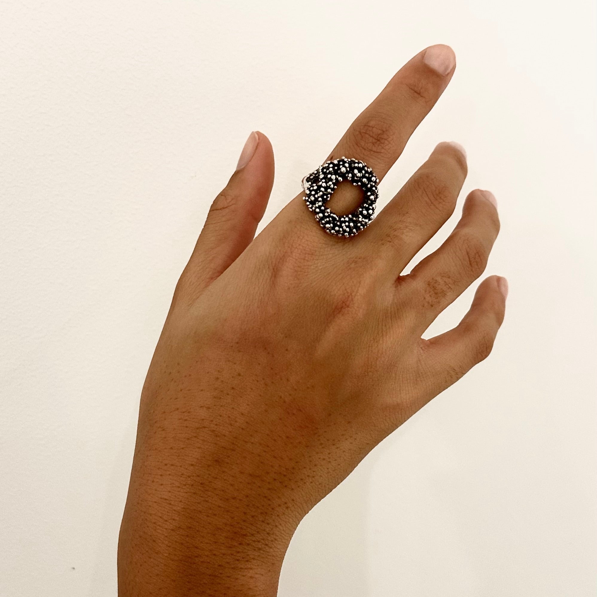 Creuse, de forme irrégulière, cette bague originale est parsemée de petites billes sur le dessus. Son anneau est de forme organique et présente une ouverture latérale afin de permettre d'ajuster la taille de la bague.
