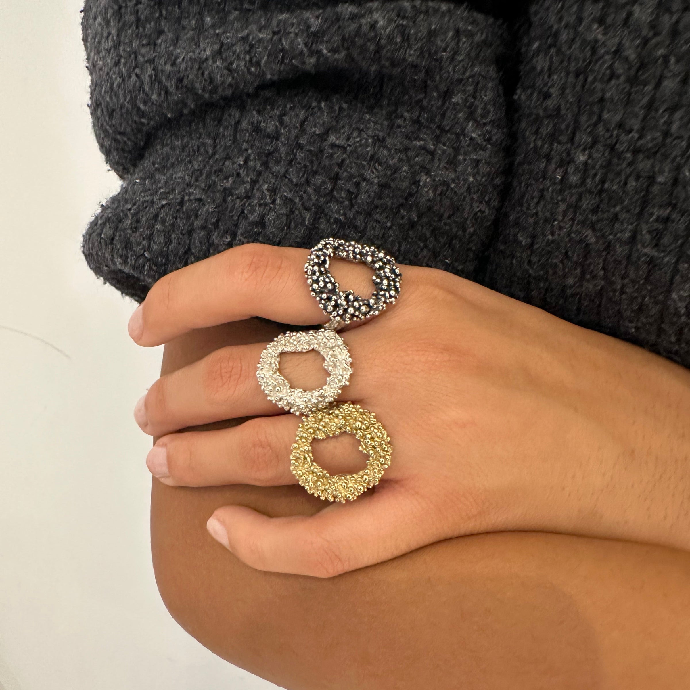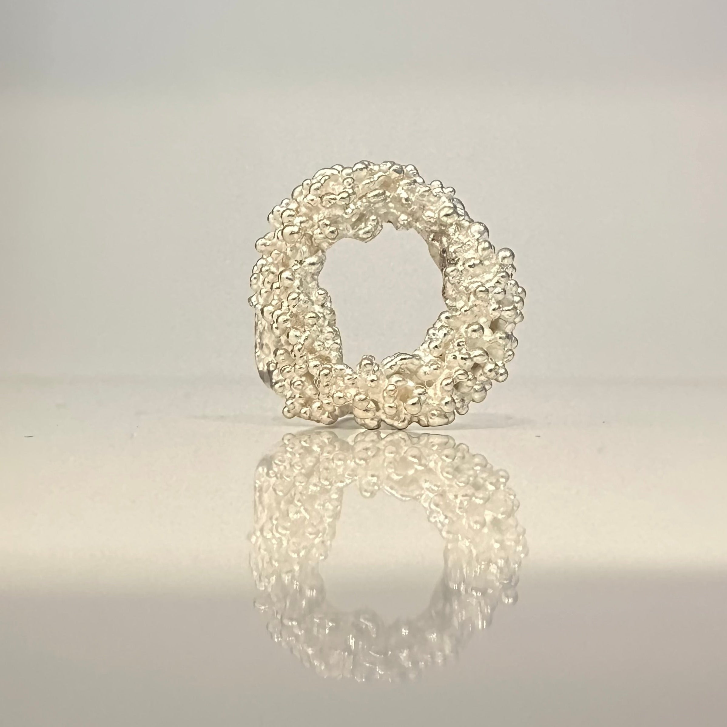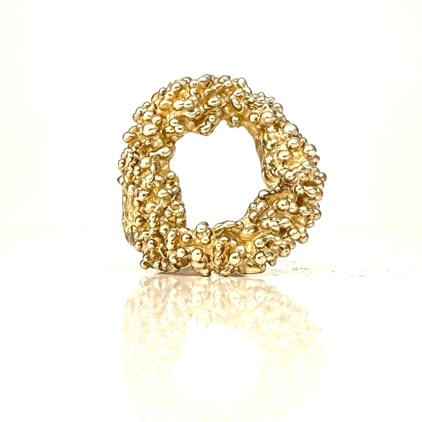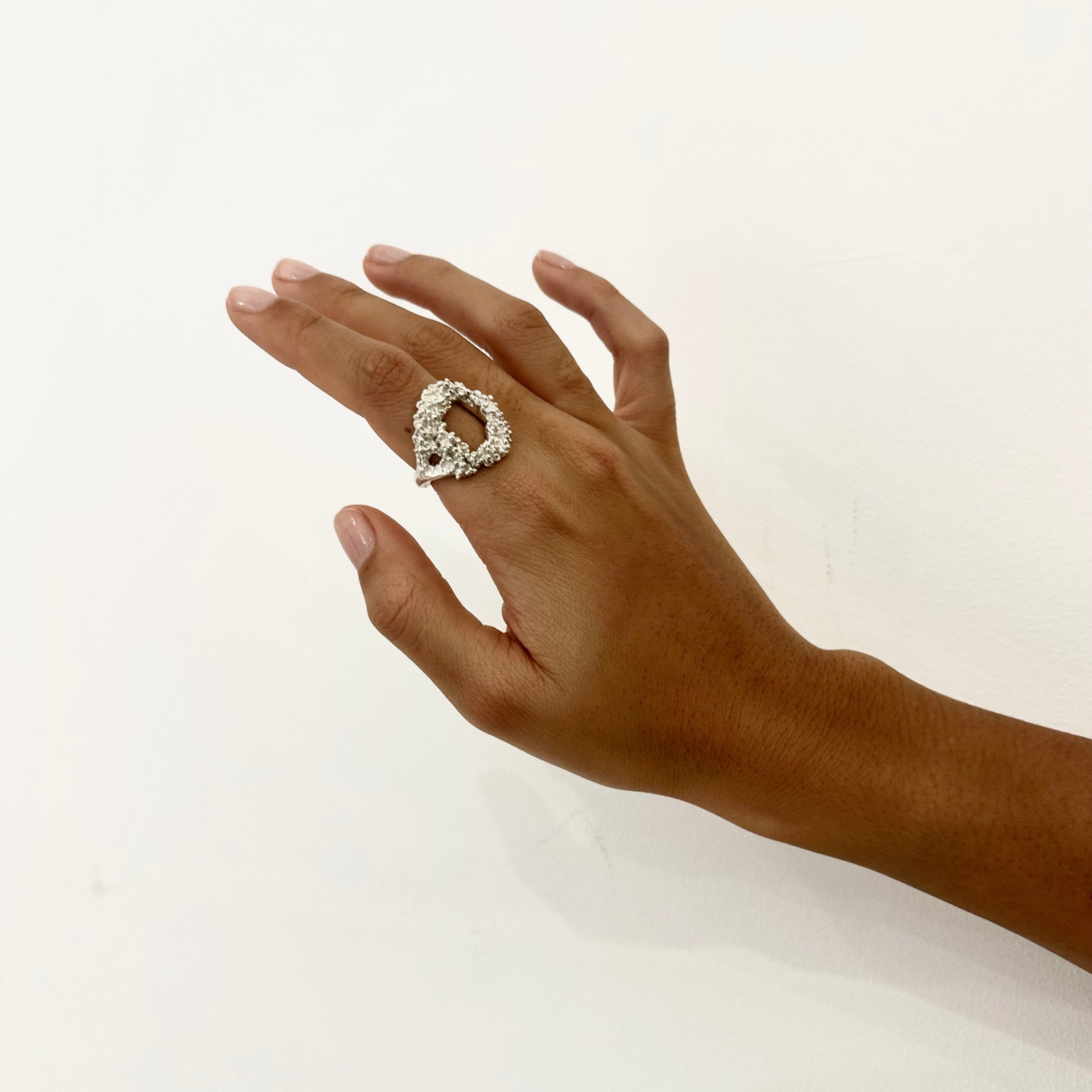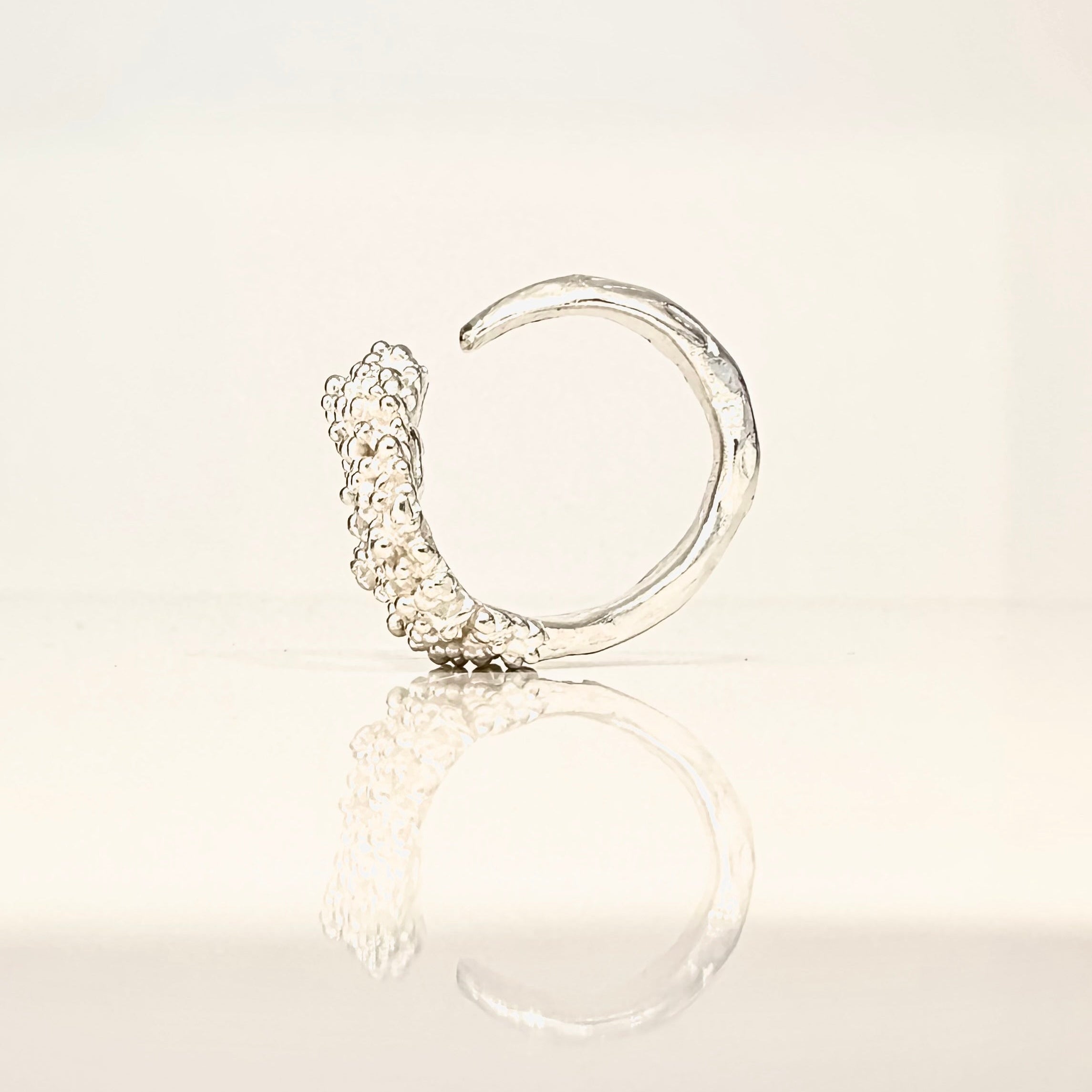 Creuse, de forme irrégulière, cette bague originale est parsemée de petites billes sur le dessus. Son anneau est de forme organique et présente une ouverture latérale afin de permettre d'ajuster la taille de la bague.