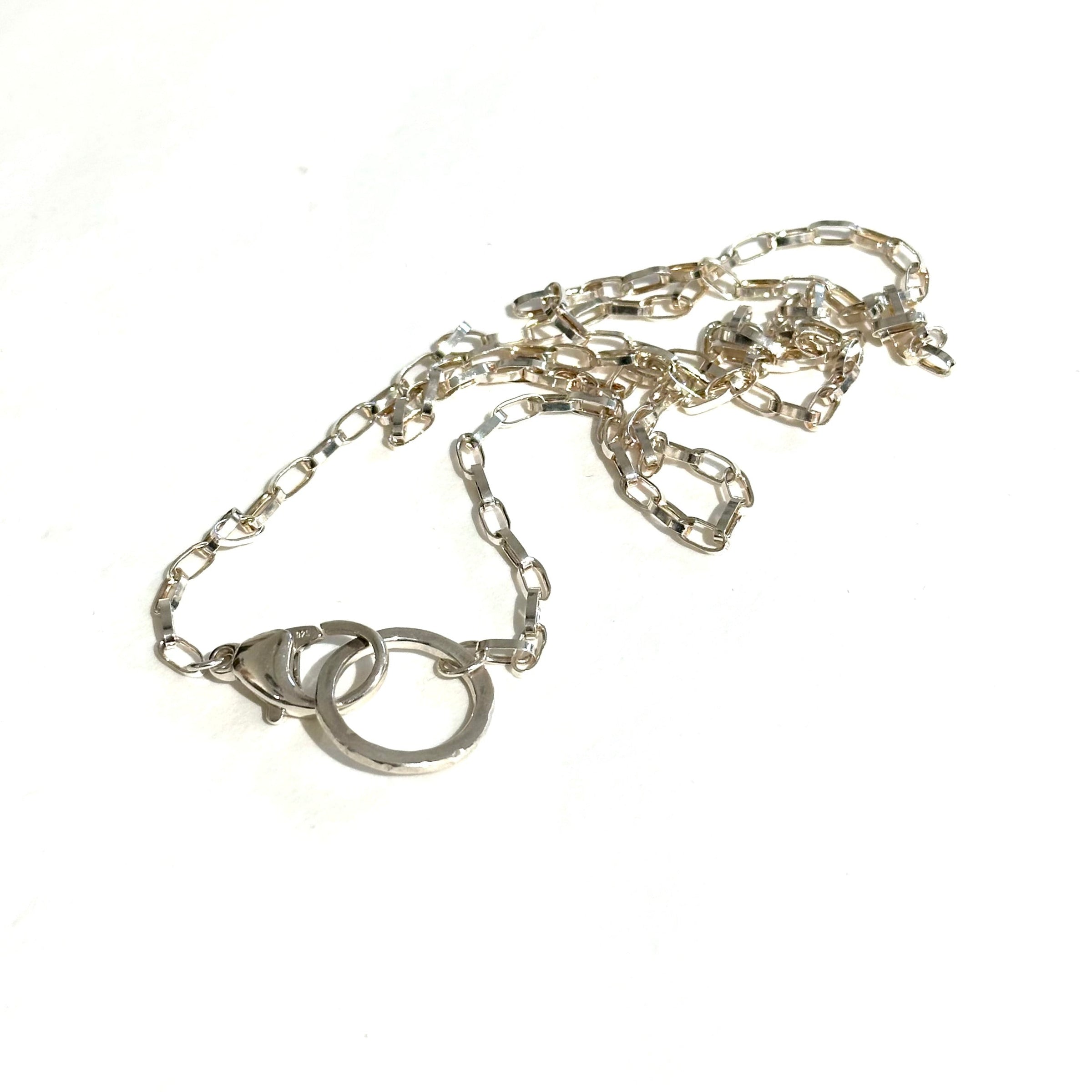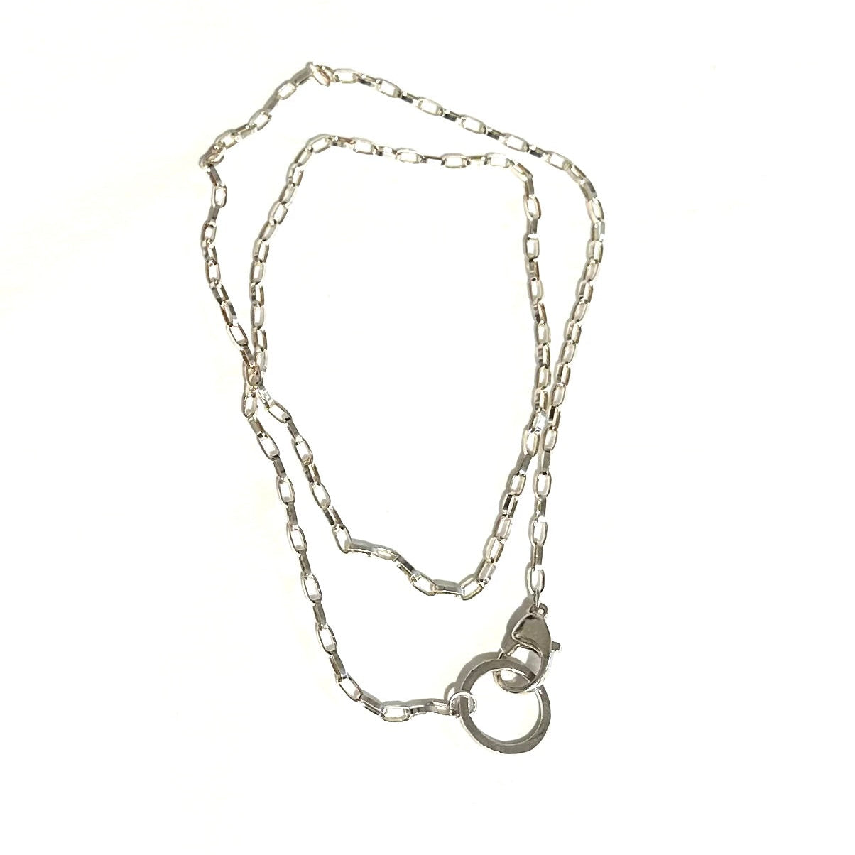 Ce collier est composé d'une longue chaîne (80 cm), terminée par un grand mousqueton (26 mm) d'un côté et par un cercle brut (2 cm) de l'autre, permettant d'y associer l'un de nos pendentifs amovibles (vendus séparément dans la catégorie "pendentifs").