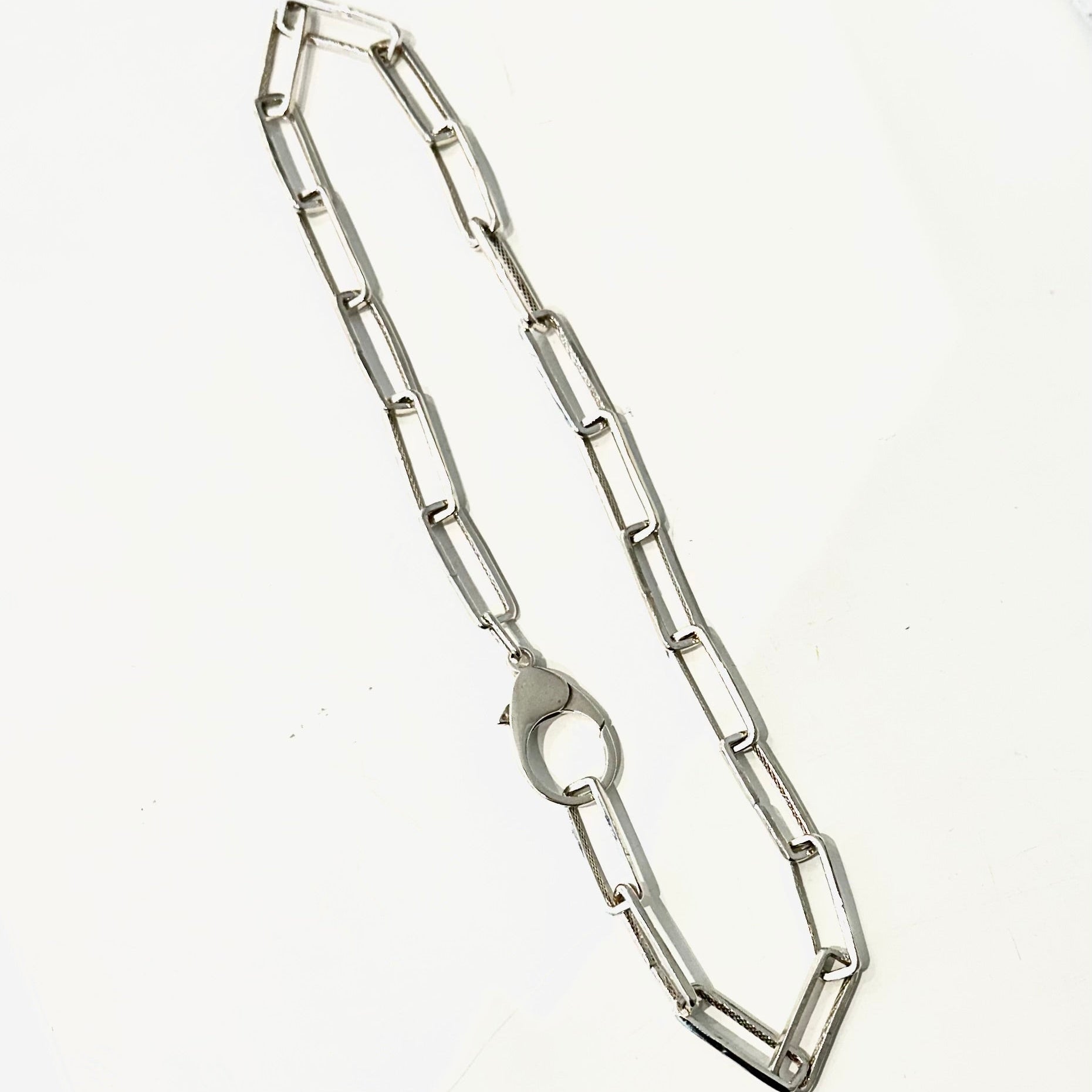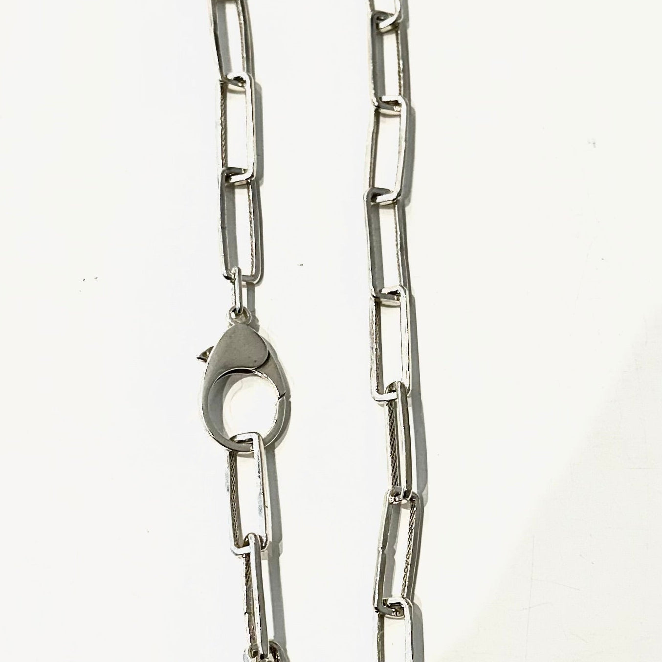 Elle est terminée par un gros mousqueton de 3 cm à grande ouverture permettant d'y associer l'un de nos pendentifs amovibles (vendus séparément dans la catégorie "pendentifs").Des maillons supplémentaires pourraient être ajoutés afin d'allonger la chaîne moyennant supplément. N'hésitez pas à nous contacter pour obtenir un devis.