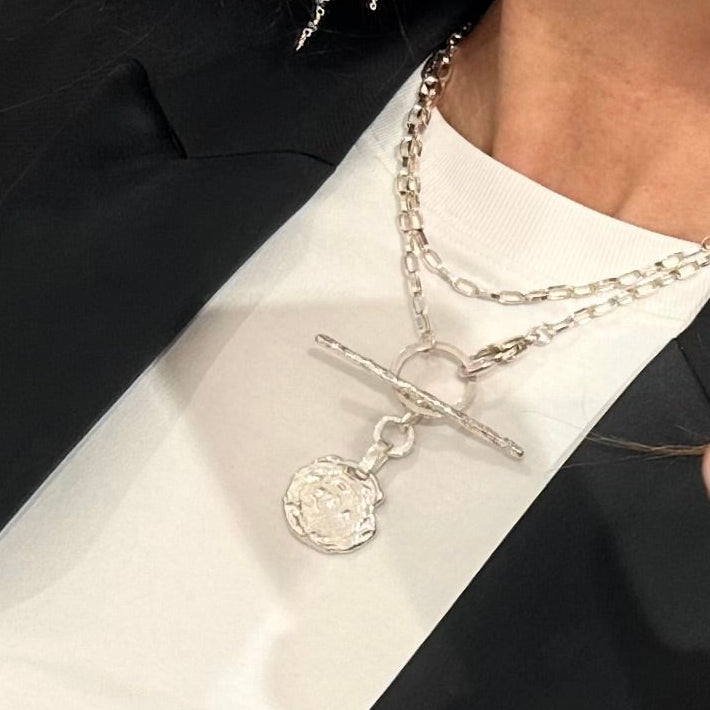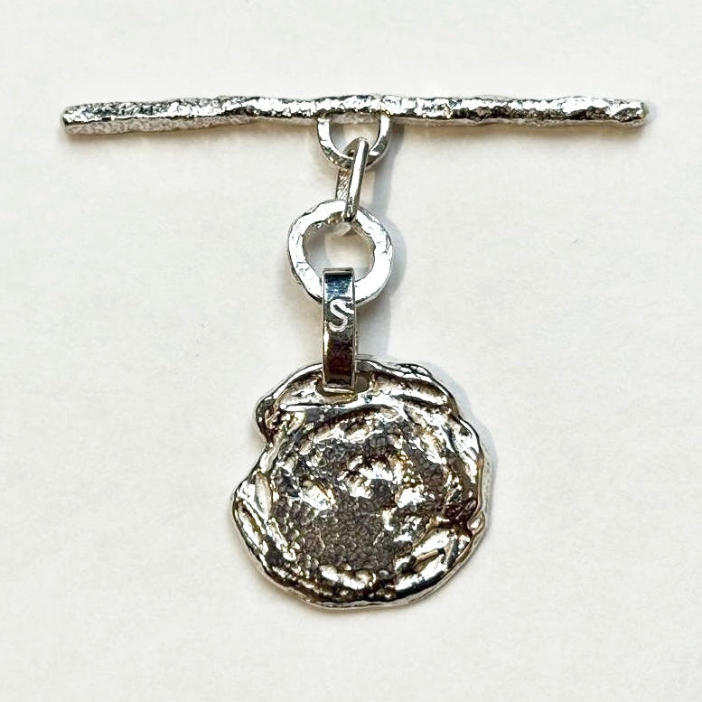 Ce pendentif médaille est réalisé en argent massif texturé par réticulation au chalumeau et avec une finition très brute.