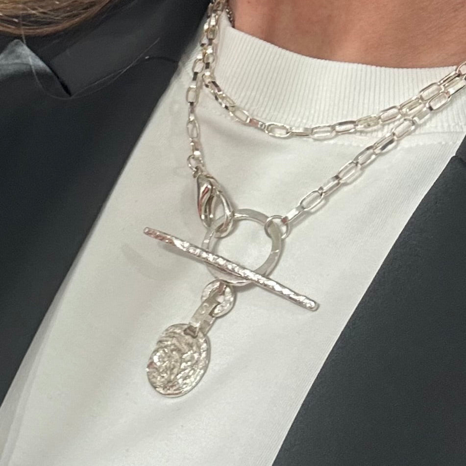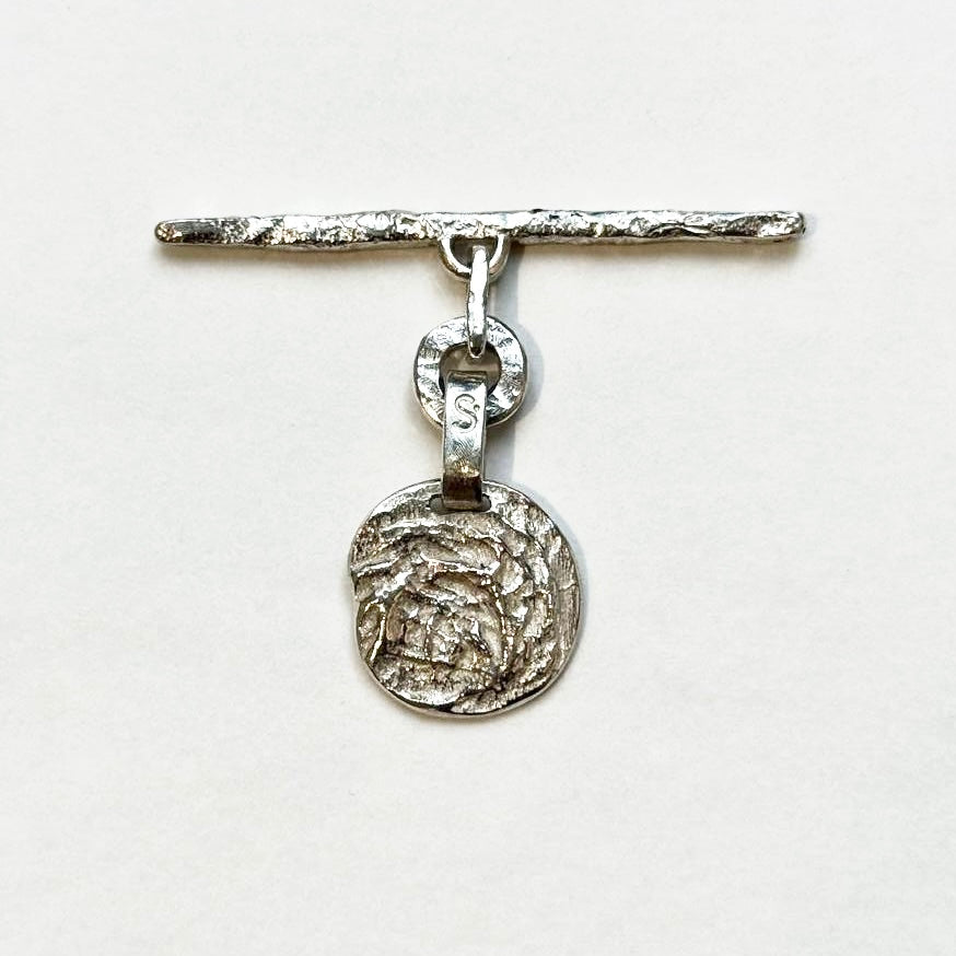Ce pendentif médaille est réalisé en argent massif texturé par réticulation au chalumeau et avec une finition très brute.